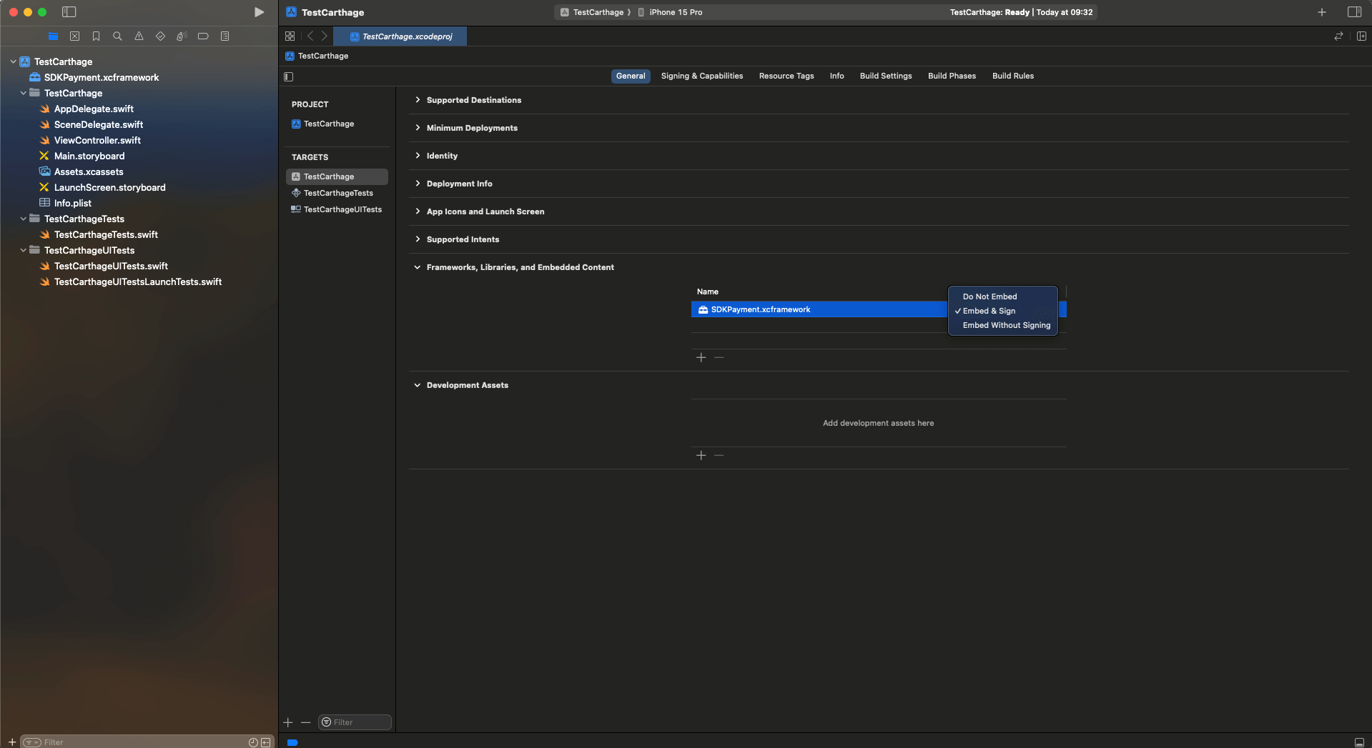 - Откройте страницу Targets -> General -> Frameworks, Libraries, and Embedded Content. В столбце Embed для фреймворков замените
